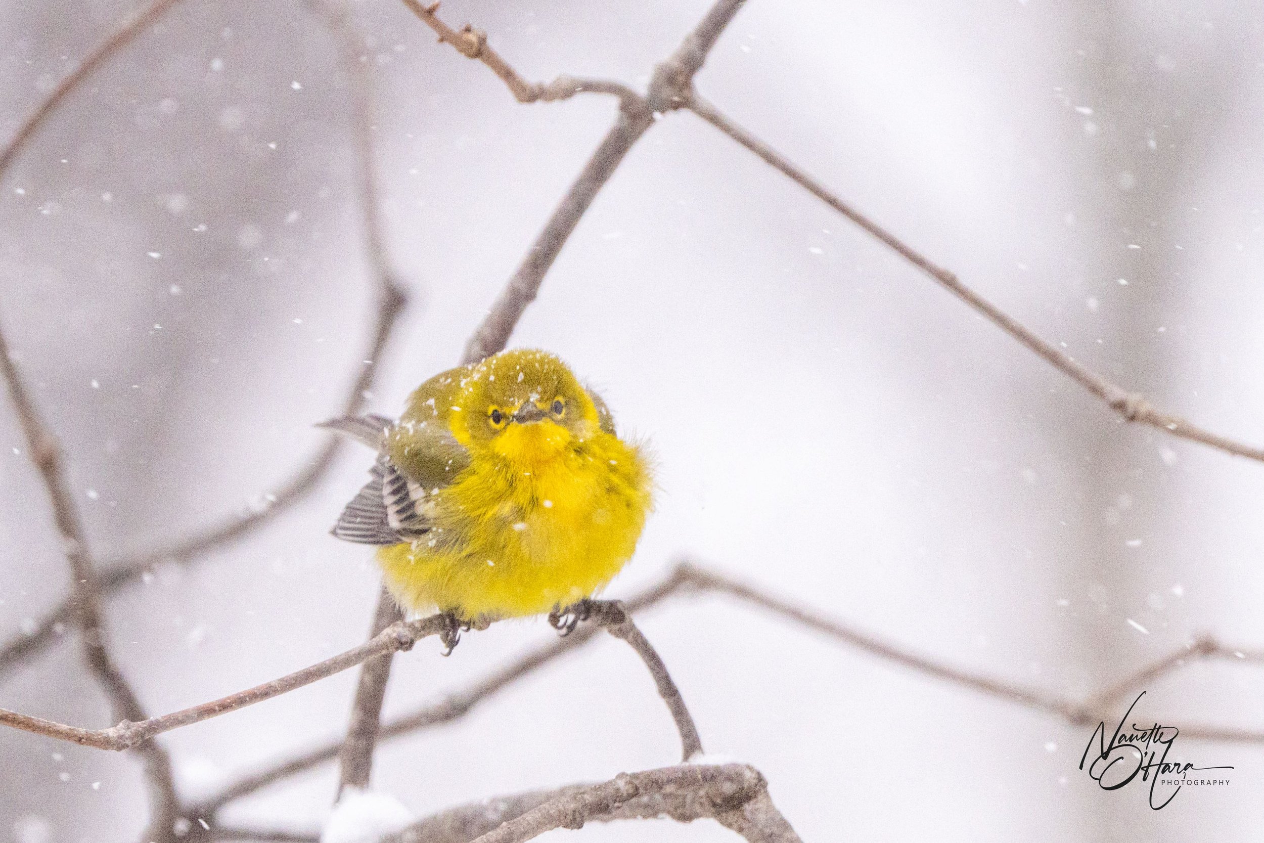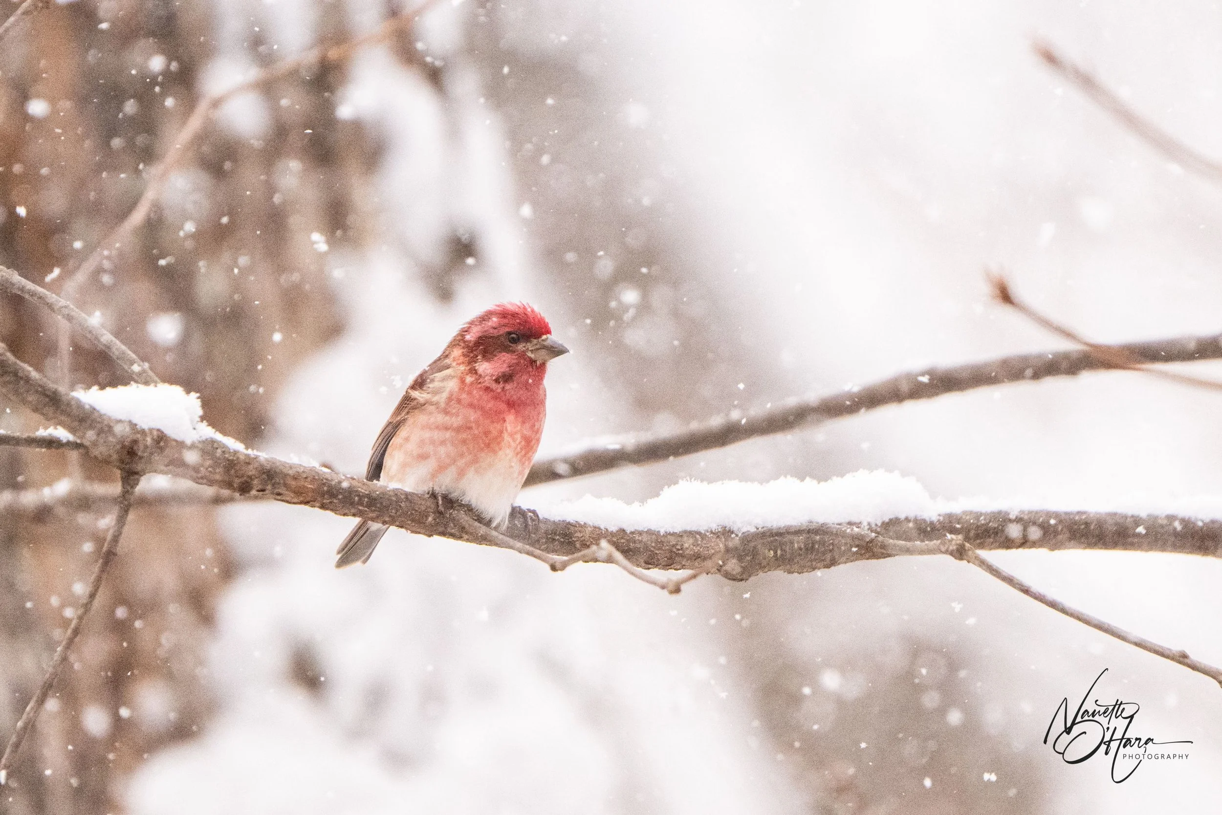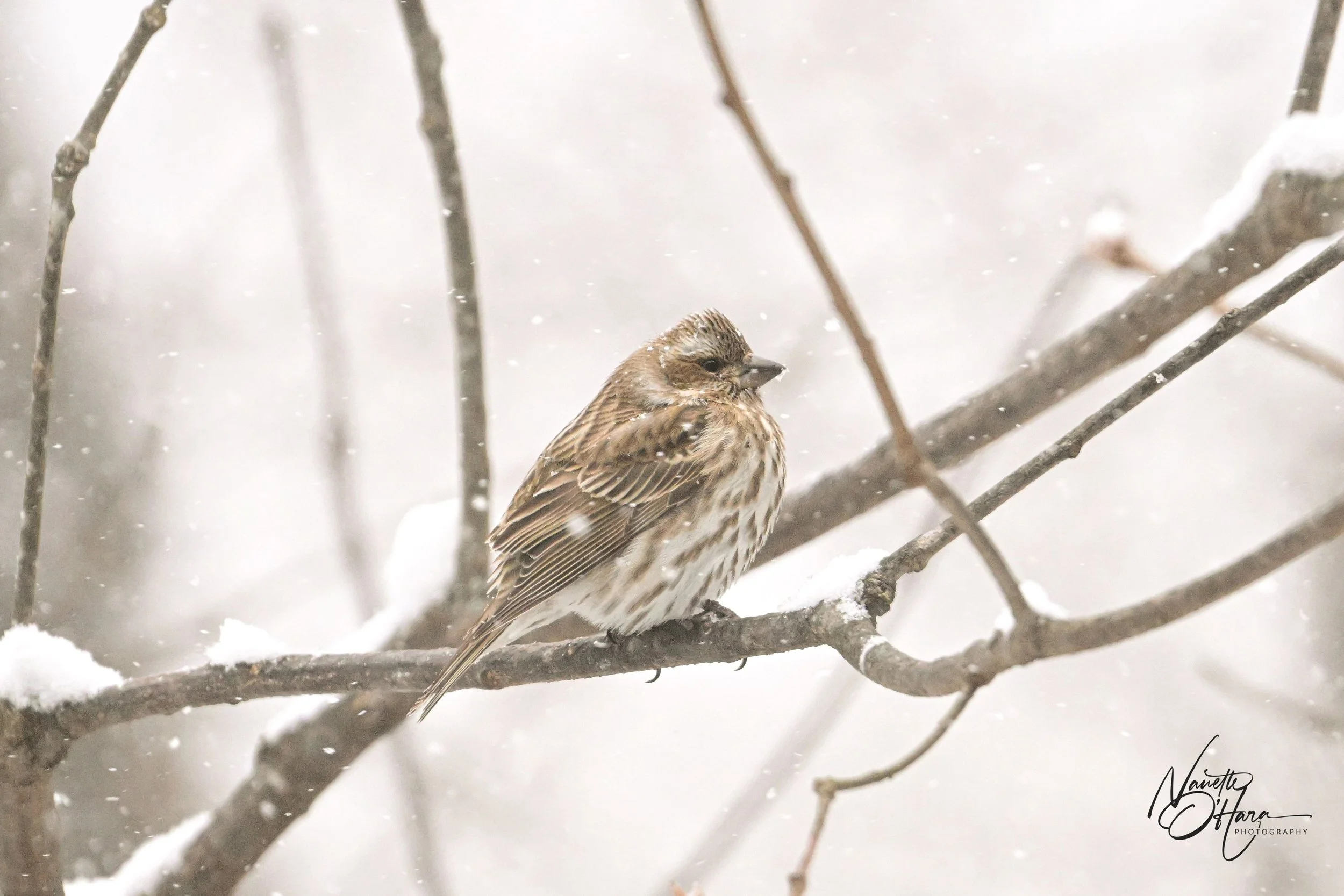 Female Finch Male Purple Finch in Snow Titmouse